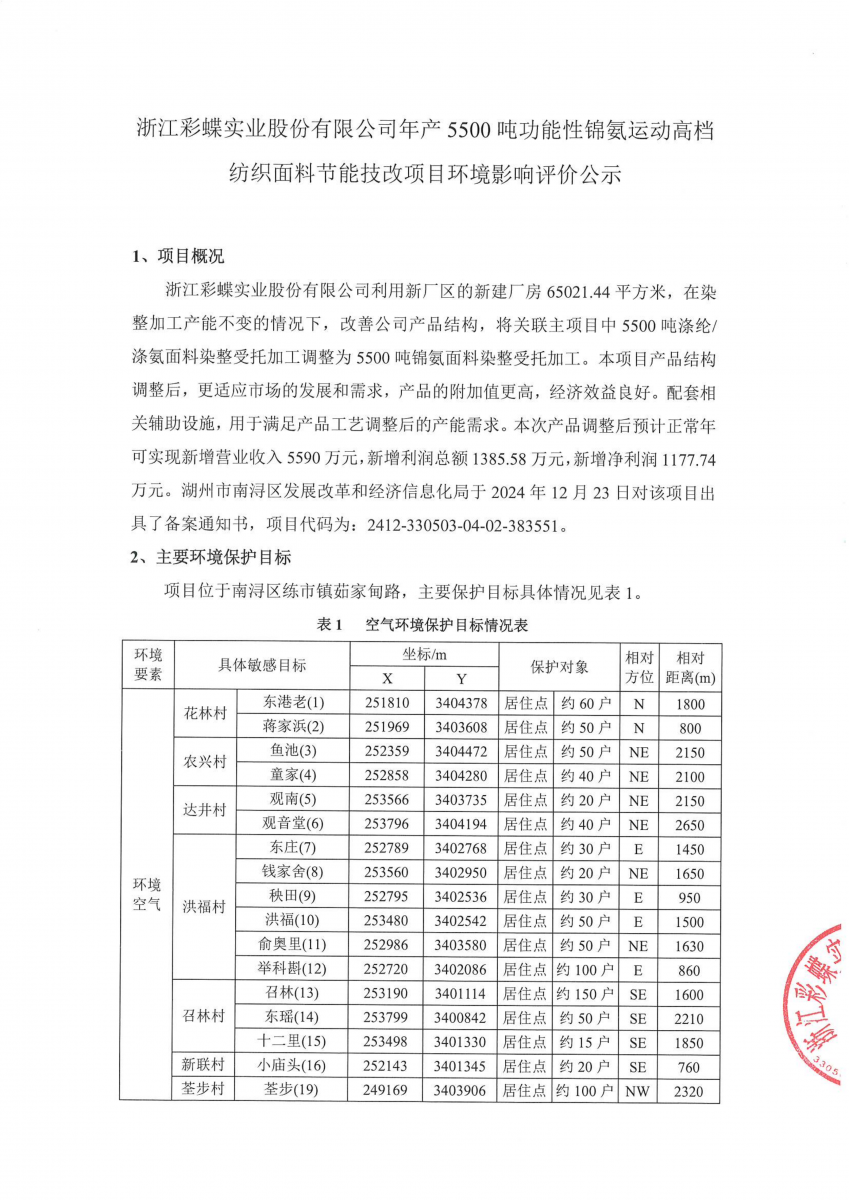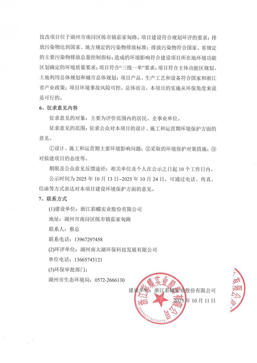 浙江彩蝶实业股份有限公司 地址:湖州市南浔区练市镇练溪大道999号 邮编:313013 电话:0572-3958999 传真:0572-3651899 邮箱:sales@chinacaidie.com 网址:www.chinacaidie.com
